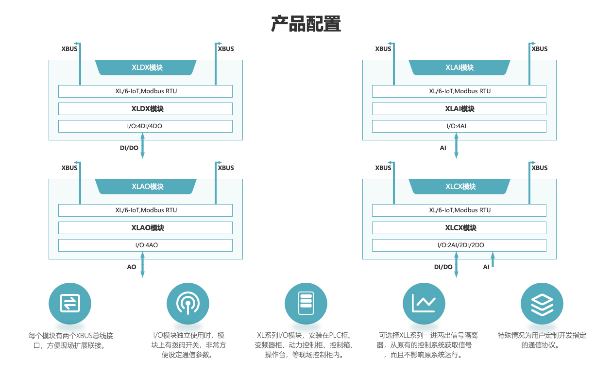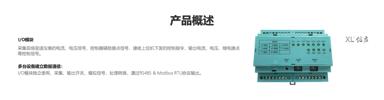 XL系列I/O模塊,采集模擬、開關信號,輸出模擬、開關信號,支持RS485、XBUS接口,Modbus RTU和XL/6通信協議。模塊化設計,方便擴展輸入、輸出數量。