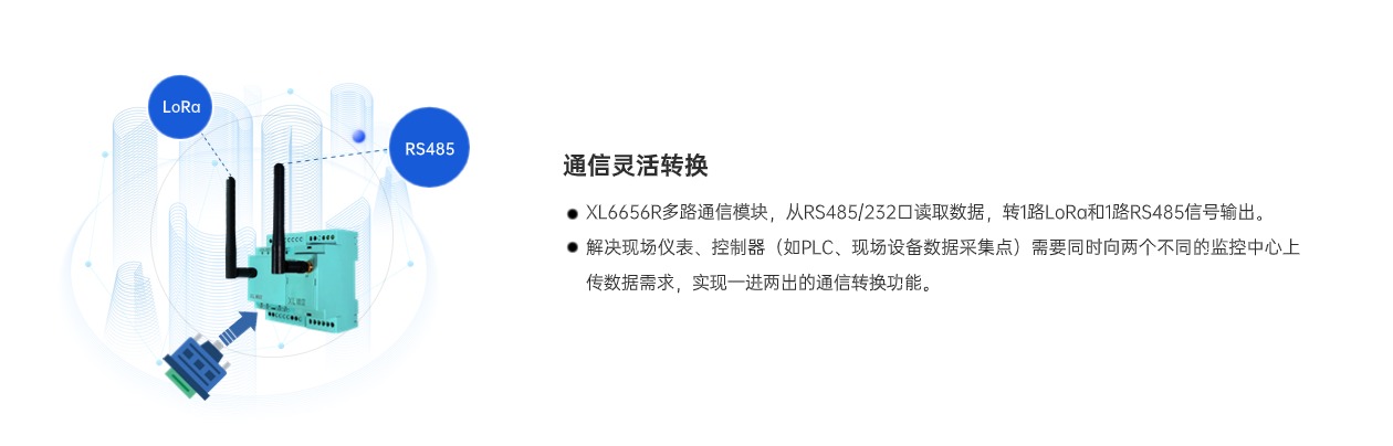 XL6656R多路通信模塊是一款高效靈活的通信轉換設備,可將RS485設備的一路輸出信號,轉為1路LoRa和1路RS485輸出信號,有效滿足了工控設備同時將數據接入兩個Modbus主站的需求,簡單、方便、易用,成本更低,滿足多種場景需求。