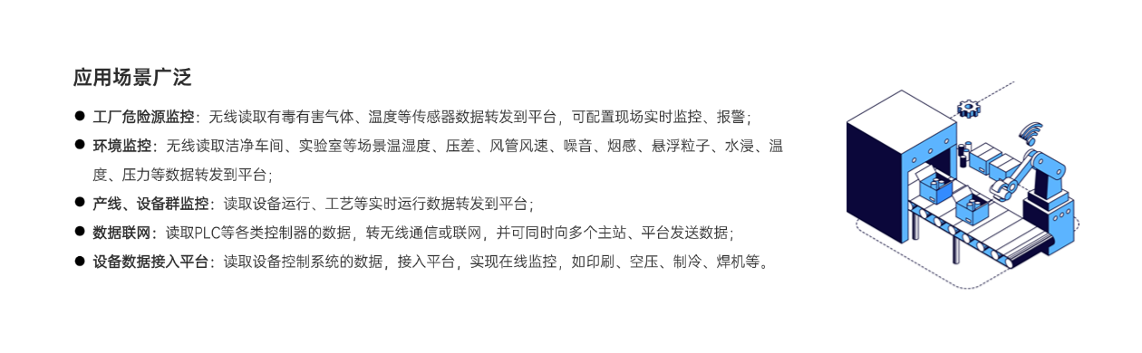 工廠危險源監(jiān)控,無線讀取有毒有害氣體、溫度等數(shù)據(jù)轉(zhuǎn)發(fā)到平臺,可配置現(xiàn)場實時監(jiān)控、報警;