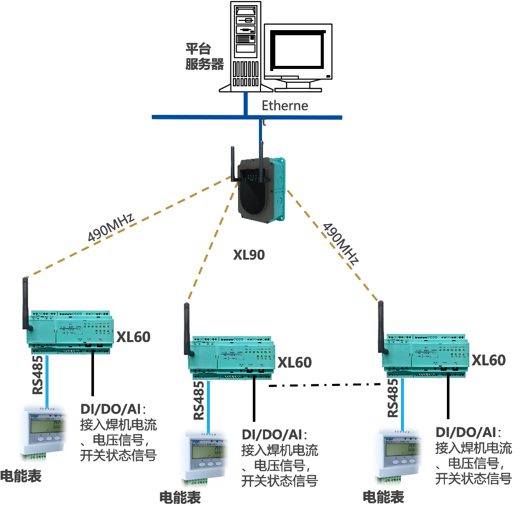 選擇XL60智能采集裝置,采集電焊機(jī)運(yùn)行信號,及電能消耗數(shù)據(jù),上傳至XL90物聯(lián)網(wǎng)關(guān)