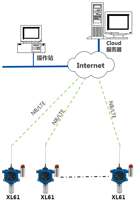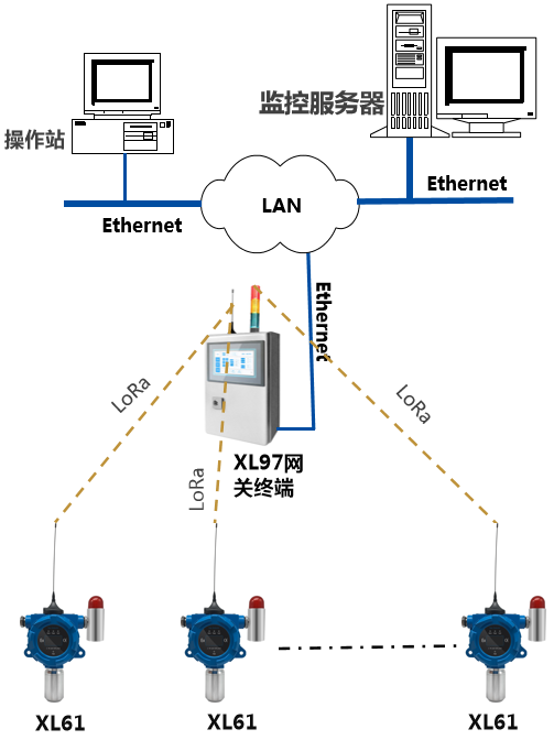 4、如增加現(xiàn)場集中監(jiān)控點,可配置XL97網(wǎng)關(guān)終端,讀取區(qū)域內(nèi)XL61上傳的數(shù)據(jù),分析處理、顯示、報警,并轉(zhuǎn)發(fā)至監(jiān)控中心服務器。