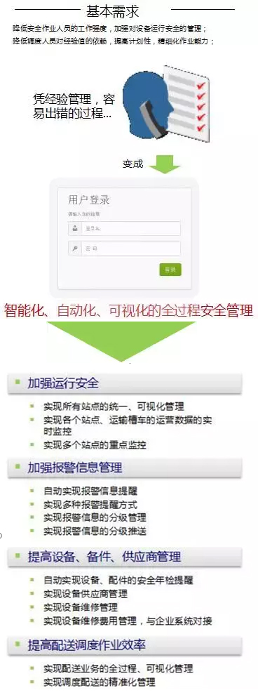 實(shí)時(shí)動(dòng)態(tài)掌握儲(chǔ)罐運(yùn)行數(shù)據(jù)、車(chē)輛罐體運(yùn)行數(shù)據(jù)、車(chē)輛行駛數(shù)據(jù)、客戶(hù)加氣數(shù)據(jù)、客戶(hù)用氣數(shù)據(jù)等;實(shí)現(xiàn)設(shè)備遠(yuǎn)程無(wú)線(xiàn)實(shí)時(shí)監(jiān)測(cè)、控制及運(yùn)行異常預(yù)警、報(bào)警等。
