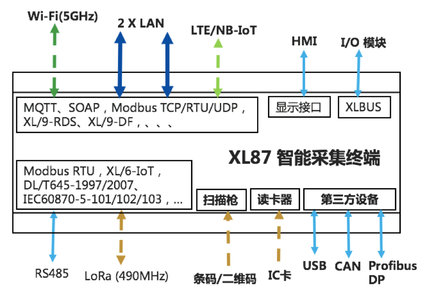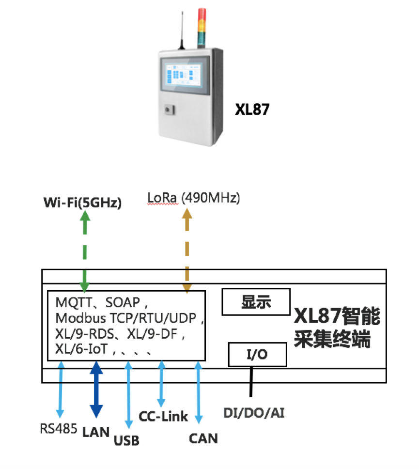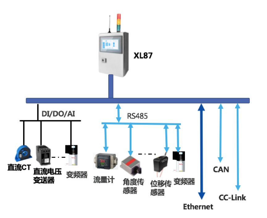 XL87智能采集終端,配置有 DI/AI/DO/AOEthernetLoRa(無線)RS485CANUSB等等接口,通過各種功能的傳感器,采集設備運行工藝數據;