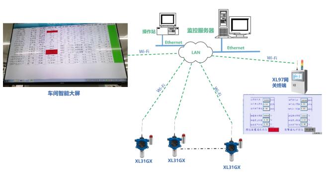 采用無線通信方式,同時在多個位置設置監視及聲光報警點,例如可在危險環境空間入口、值班室設置數據監視及聲光報警點,在車間、工廠大屏上實時顯示有毒有害氣體濃度數據。