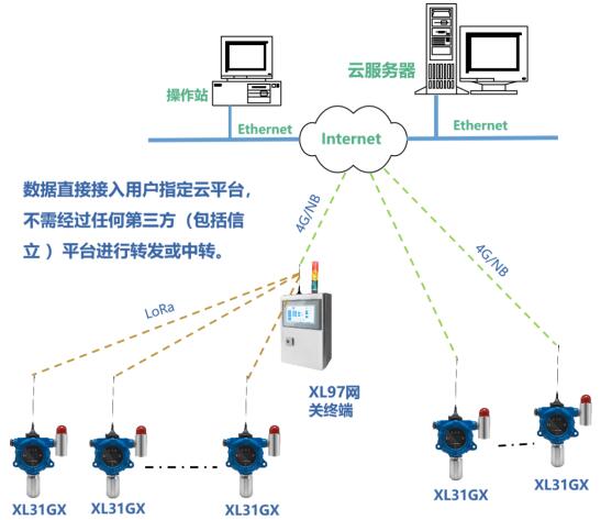 l XL31GX智能氣體檢測儀,通過LoRa接入網關終端,網關終端通過4G接入云平臺。
