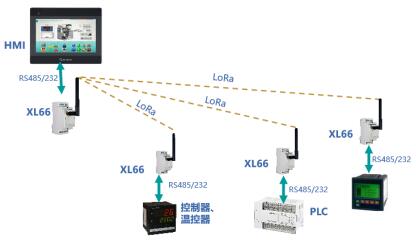 一臺XL66與多臺XL66連接,實現(xiàn)一對多,RS485/232設備間無線通信。