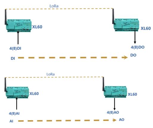 選擇一對基于LORA無線傳輸模塊的XL60主機,其中一臺配置在現(xiàn)場采集端,通過RS485采集現(xiàn)場儀表的電流、電壓、開關(guān)等信號,另一臺配置在控制儀表端,通過RS485與PLC、控制機臺、顯示儀表等連接,現(xiàn)場采集端的XL60可將采集到的數(shù)據(jù)通過LORA無線對傳到控制儀表端的XL60并上傳至控制儀表。