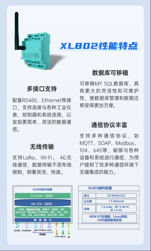 考慮到檢測車間與生產監控中心距離較遠,不便敷設電纜, XL802 通信主機采用 Wi-Fi 無線通信方式(可選 4G 通信),將采集到的數據直接推送到生產監控中心,便于集中處理和分析。