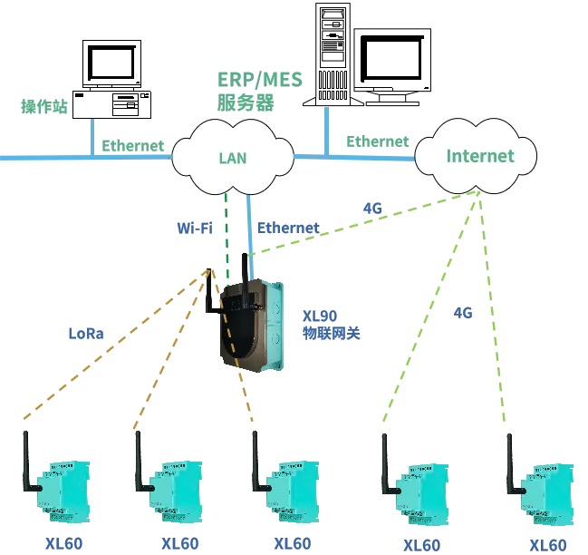 接入企業監控平臺:XL60無線采集模塊采用LoRa無線傳輸數據至XL90網關,網關通過Ethernet/WiFi等方式接入監控平臺;
